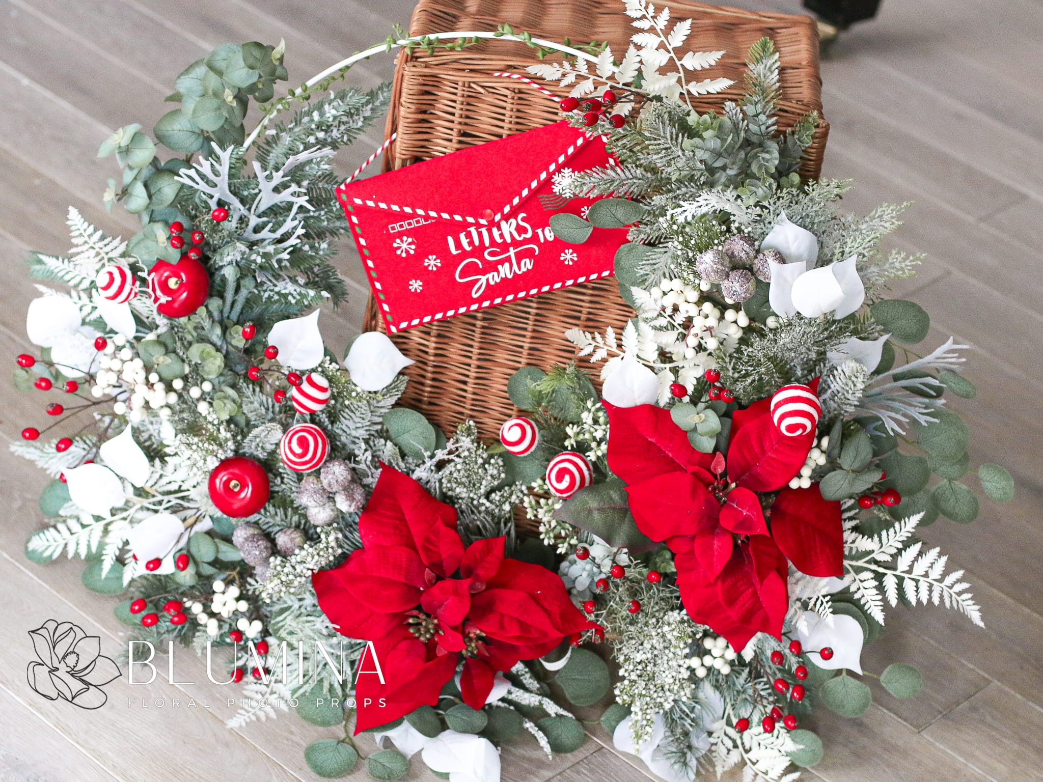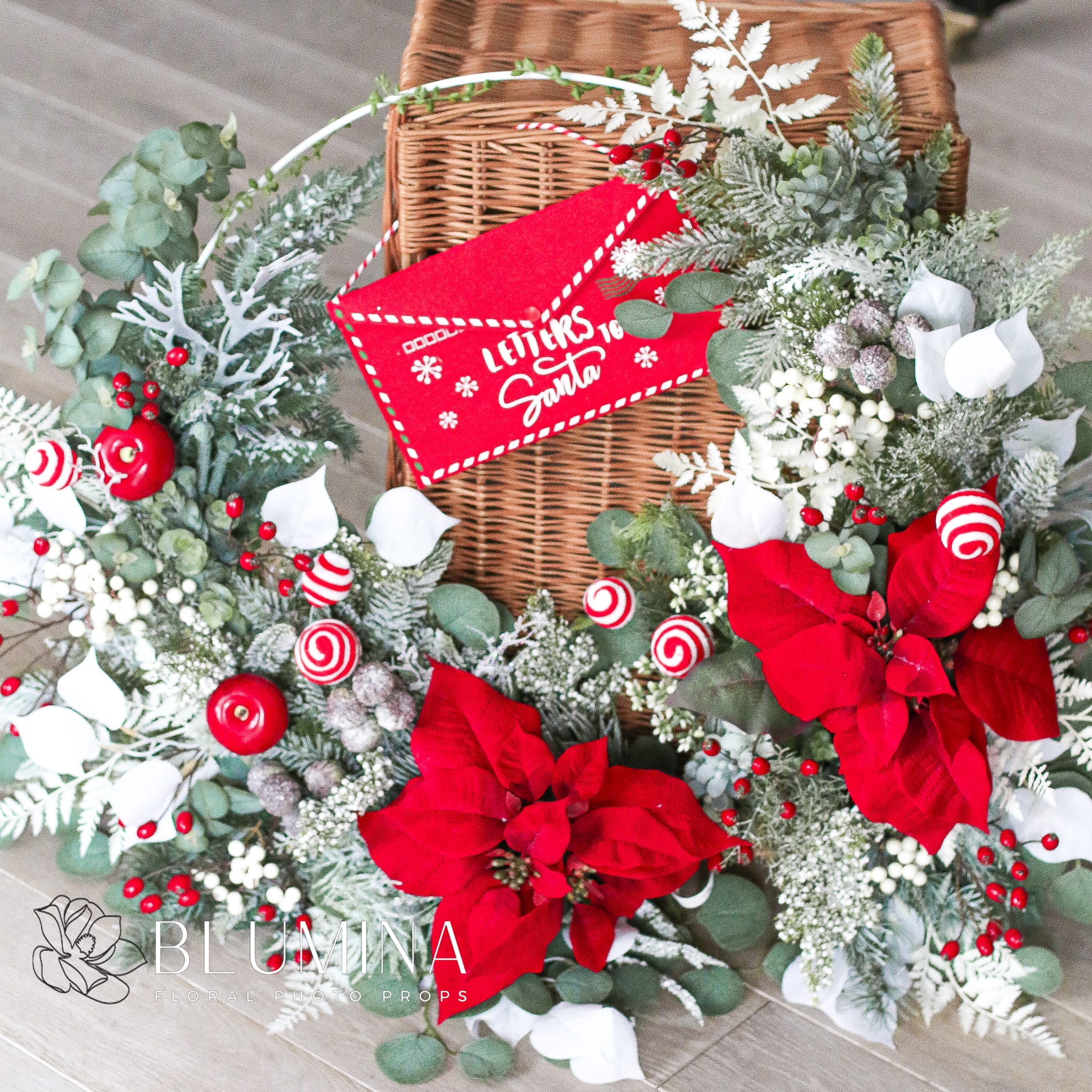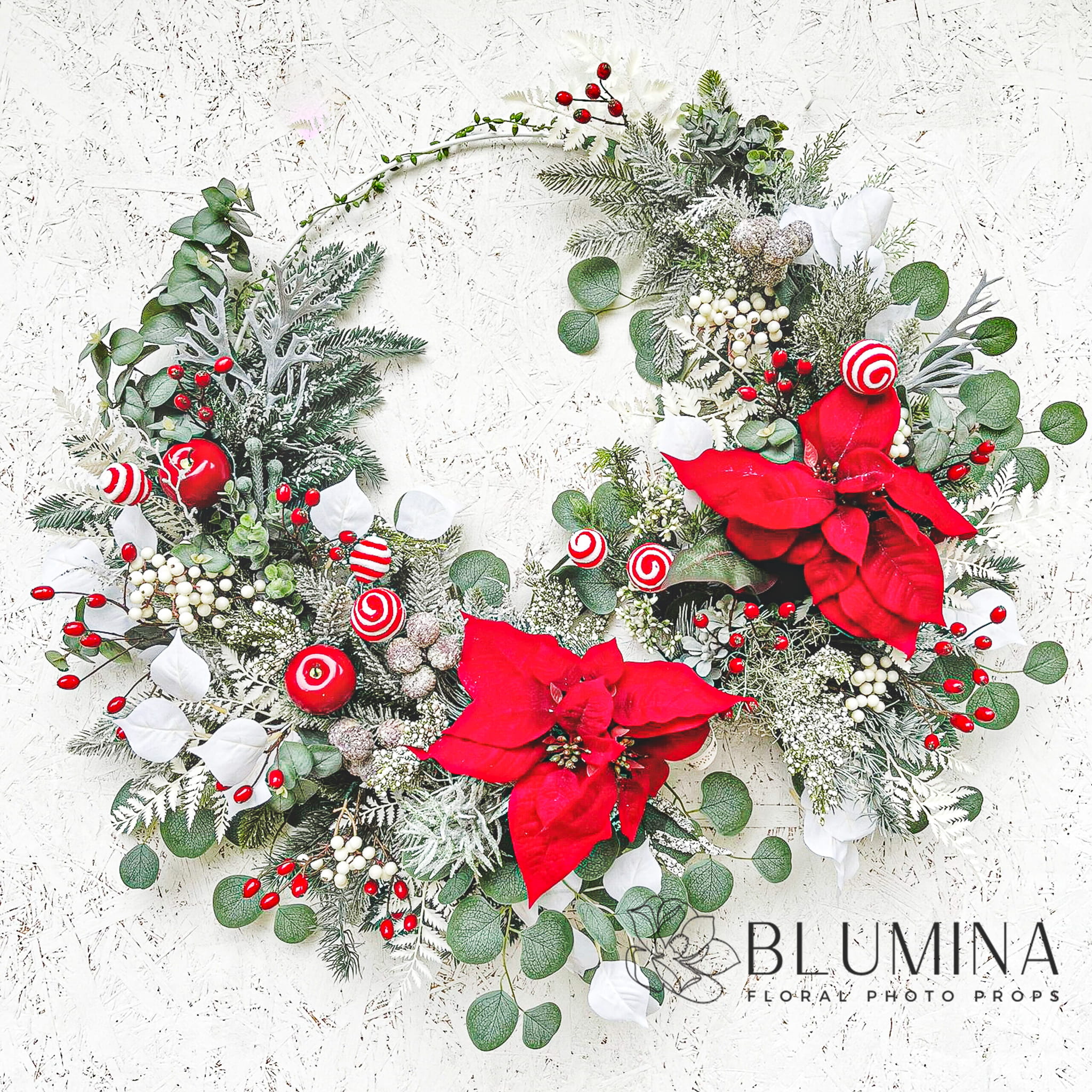 Wieniec wykonany miksu lekko ośnieżonej, zimowej zieleni, czerwonych dodatków oraz pięknych, realistycznie wyglądających kwiatów poinsecji.