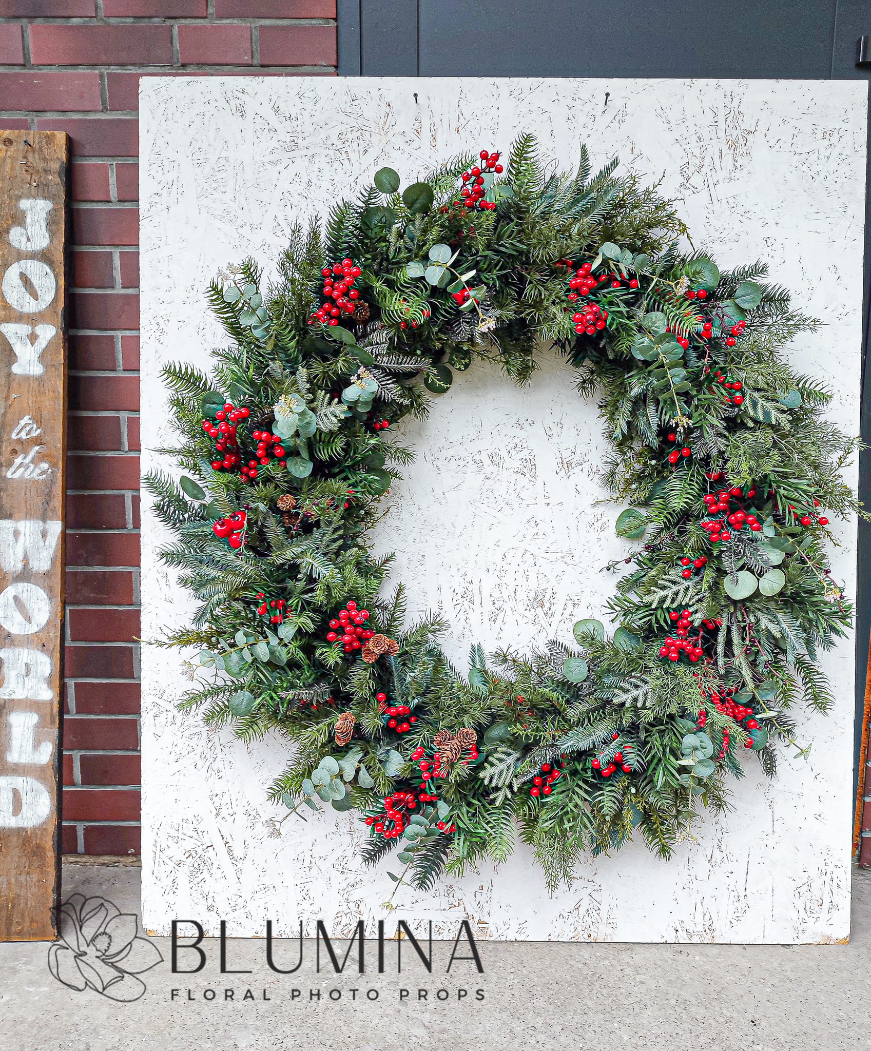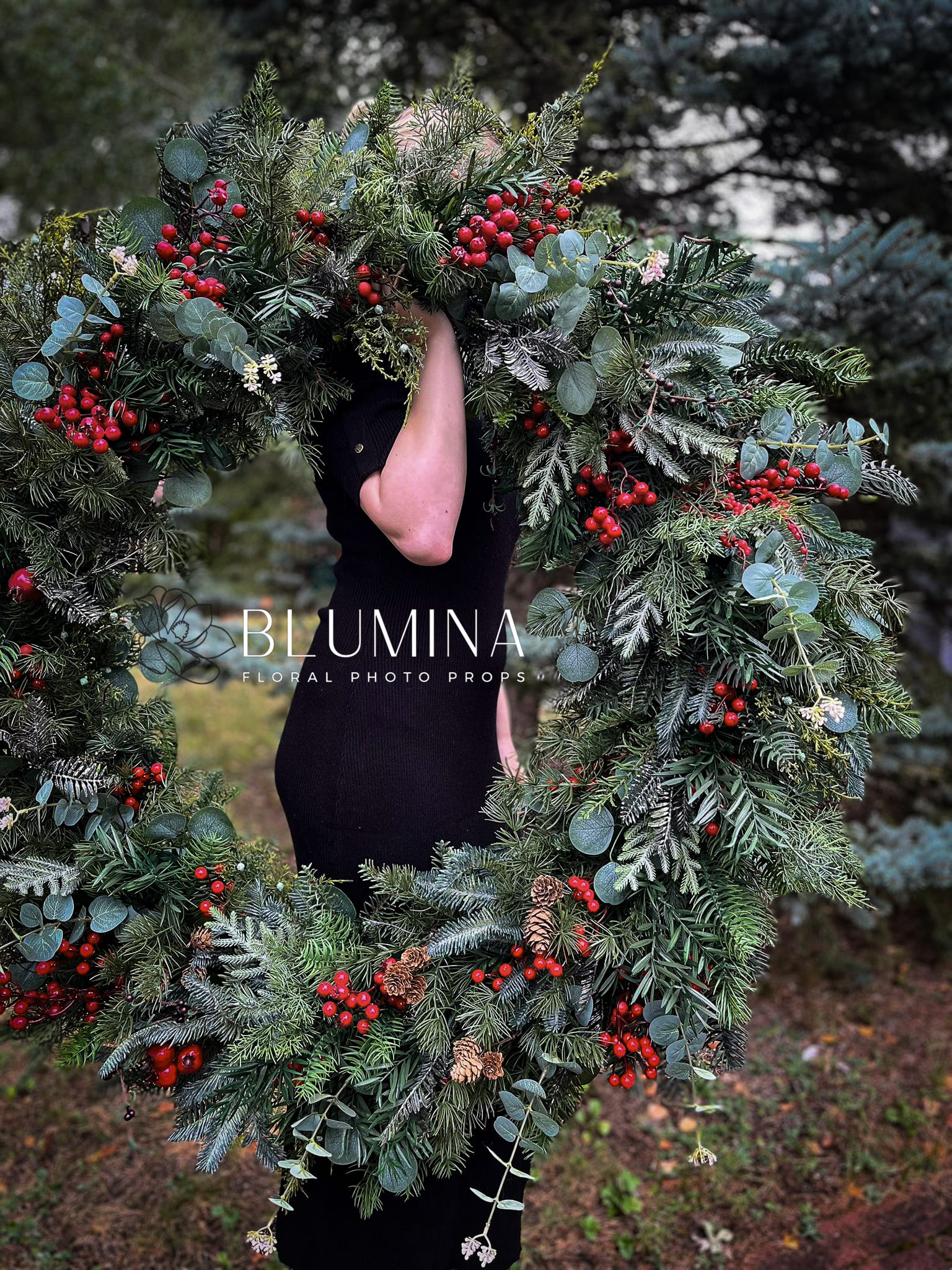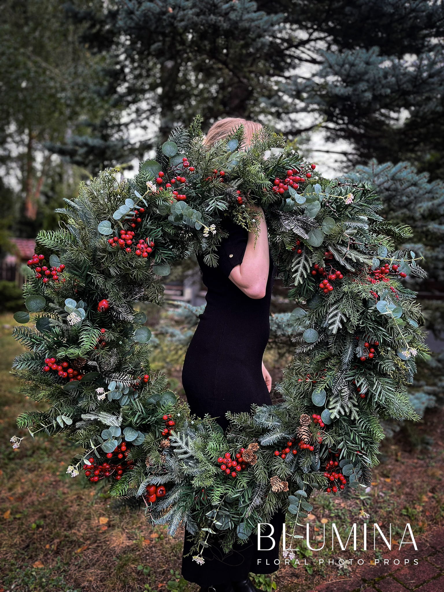 Wieniec wykonany został ręcznie w naszej pracowni, z wykorzystaniem miksu najładniejszej, różnorodnej, zimowej zieleni, jagód i eukaliptusa.