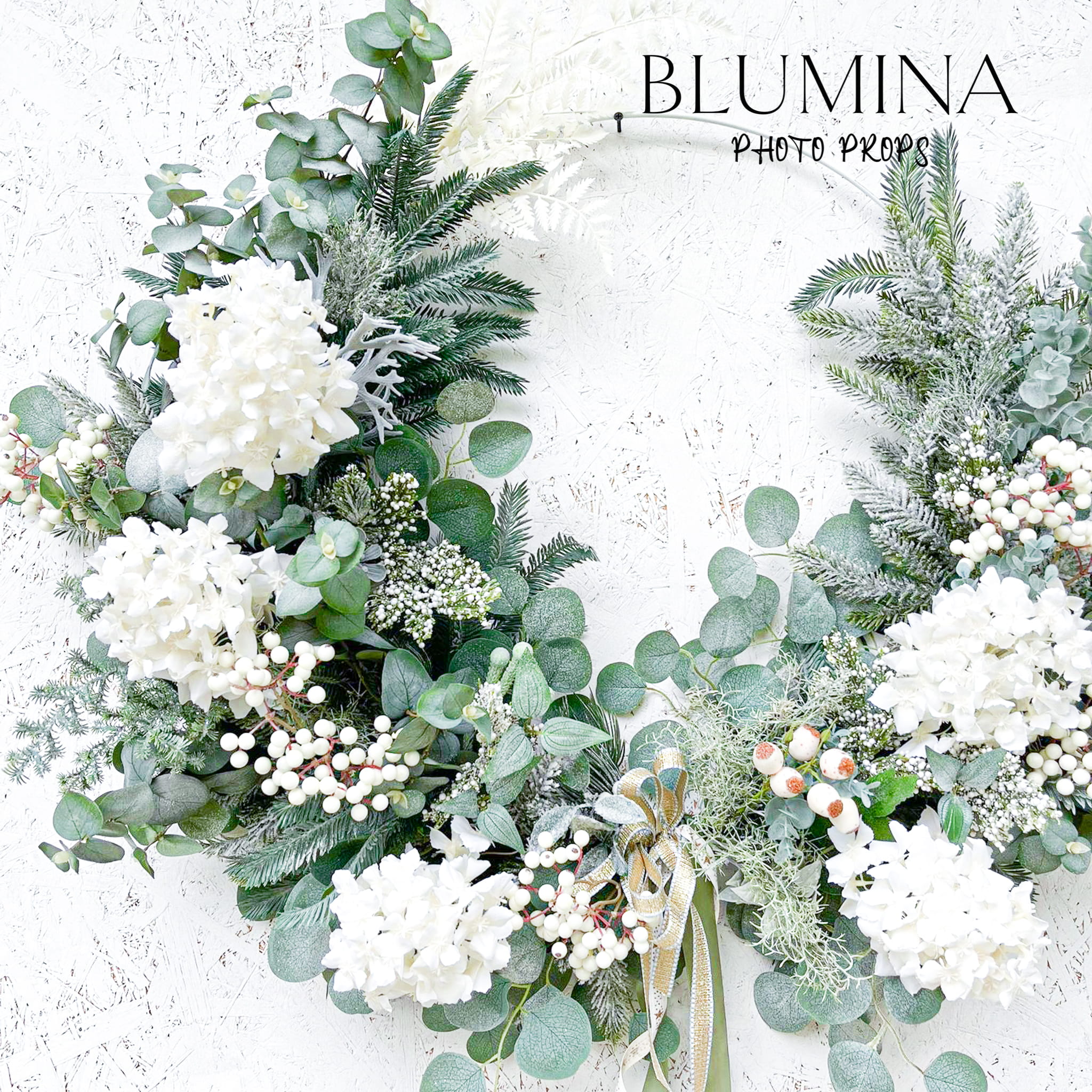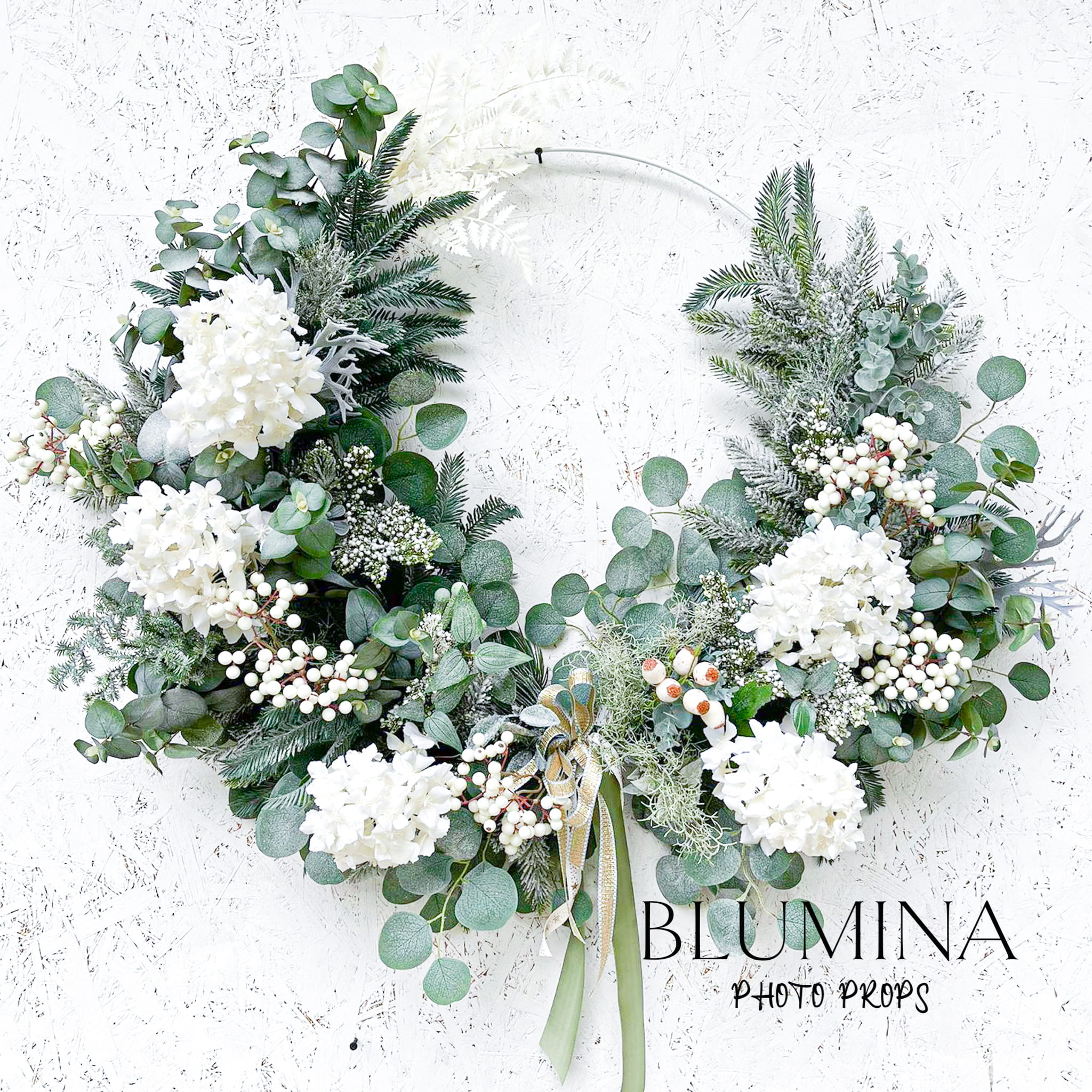 Wieniec wykonany został ręcznie w naszej pracowni, z wykorzystaniem miksu najładniejszej, różnorodnej, zimowej zieleni, ośnieżonych kwiatów hortensji i eukaliptusa.