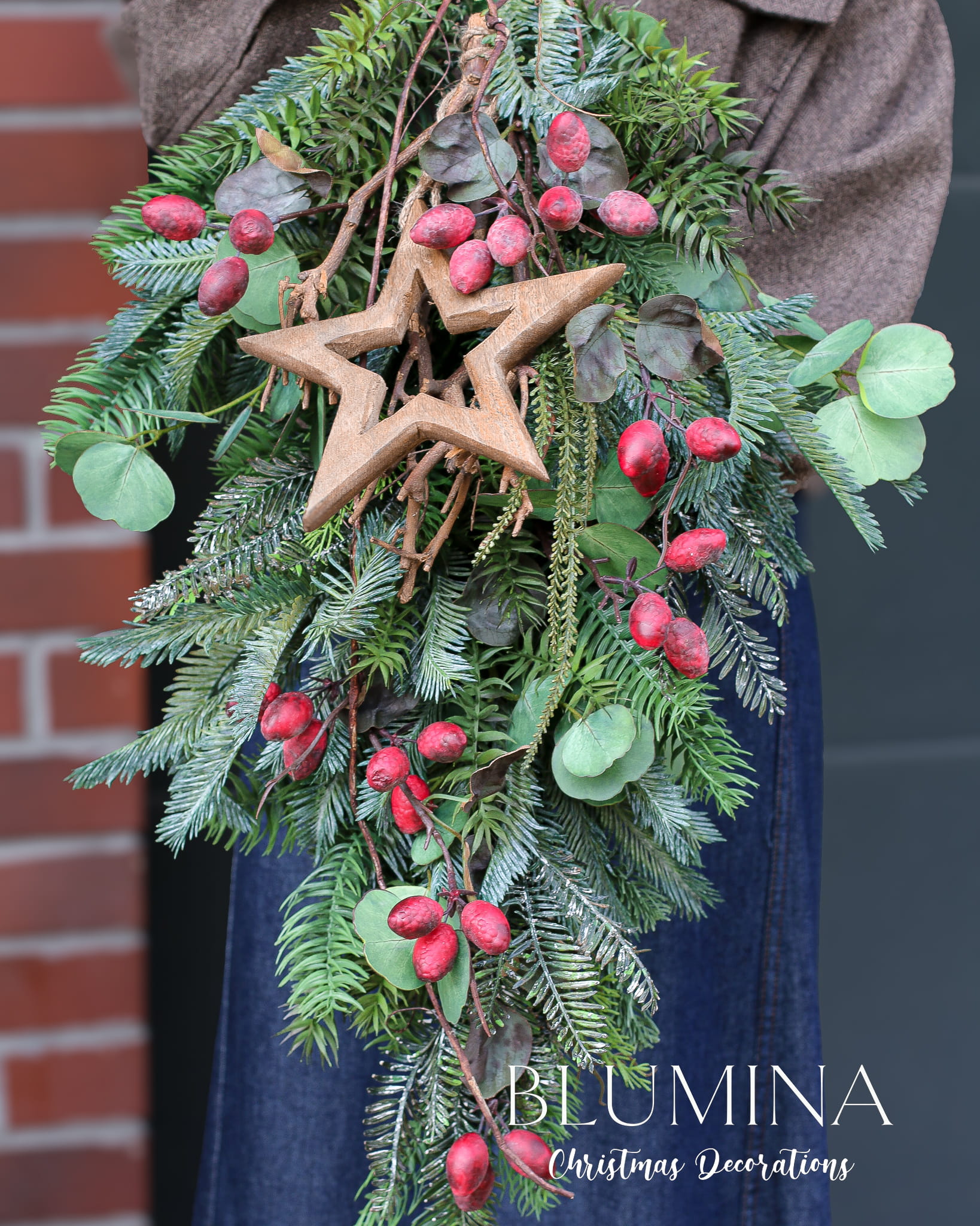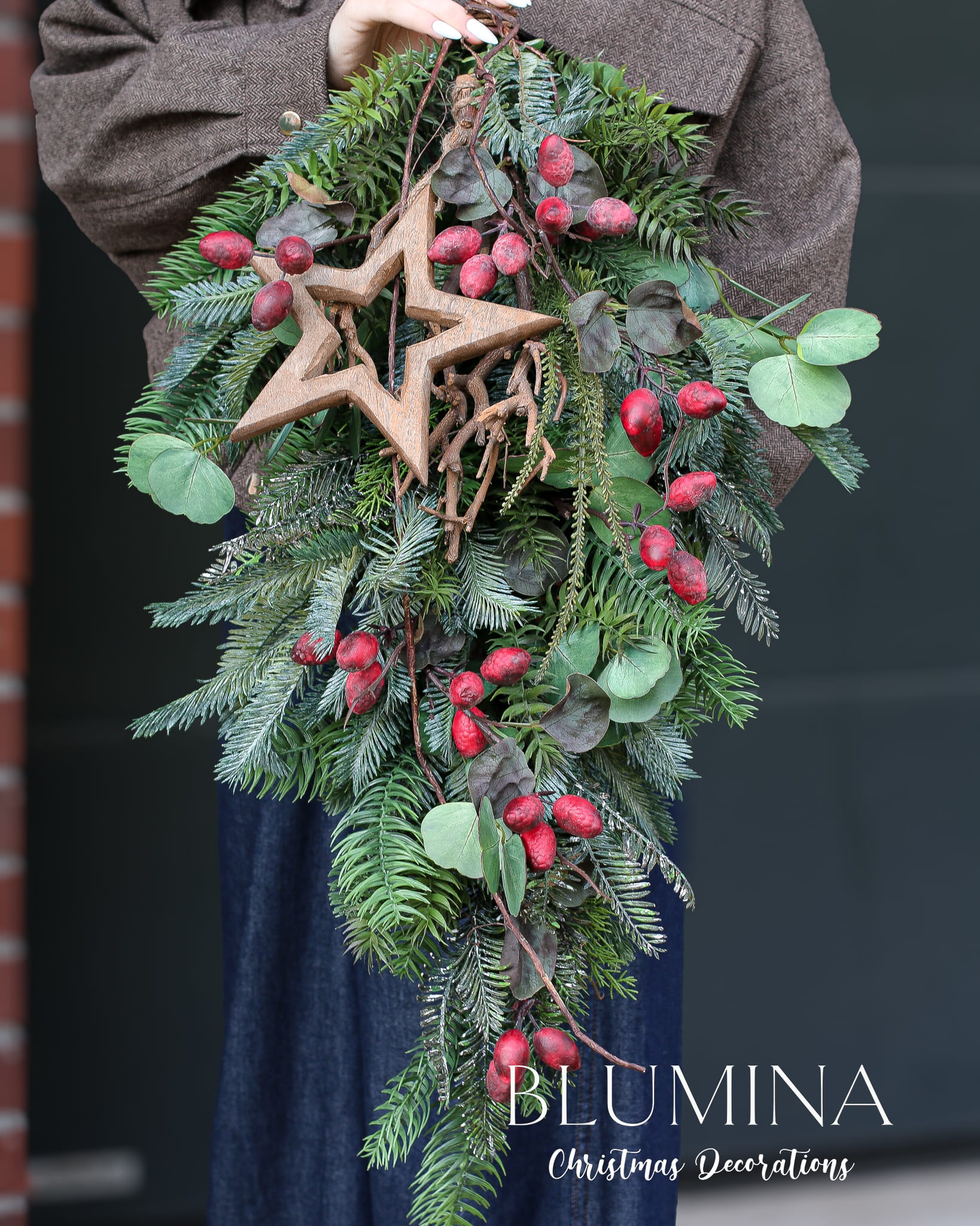 Zimowa zawieszka, wykonana z różnorodnego, sztucznego igliwia, eukaliptusa i głogu.