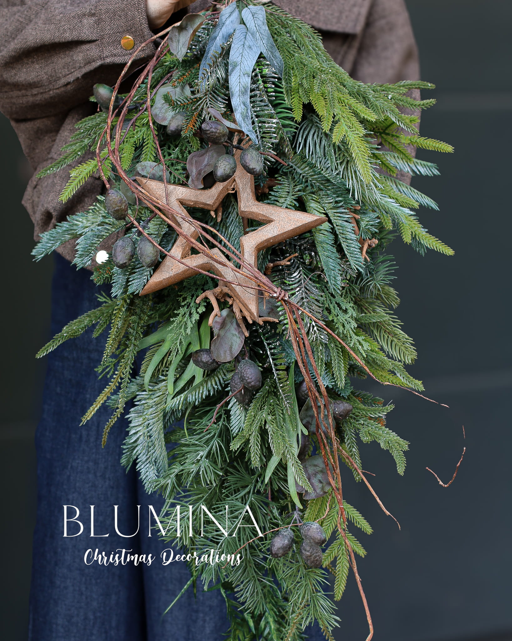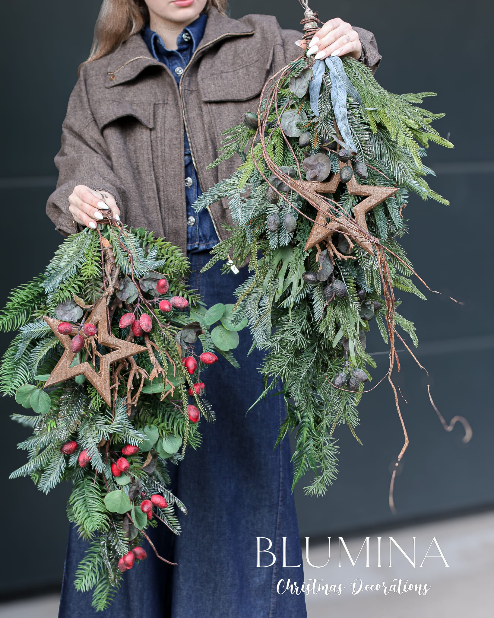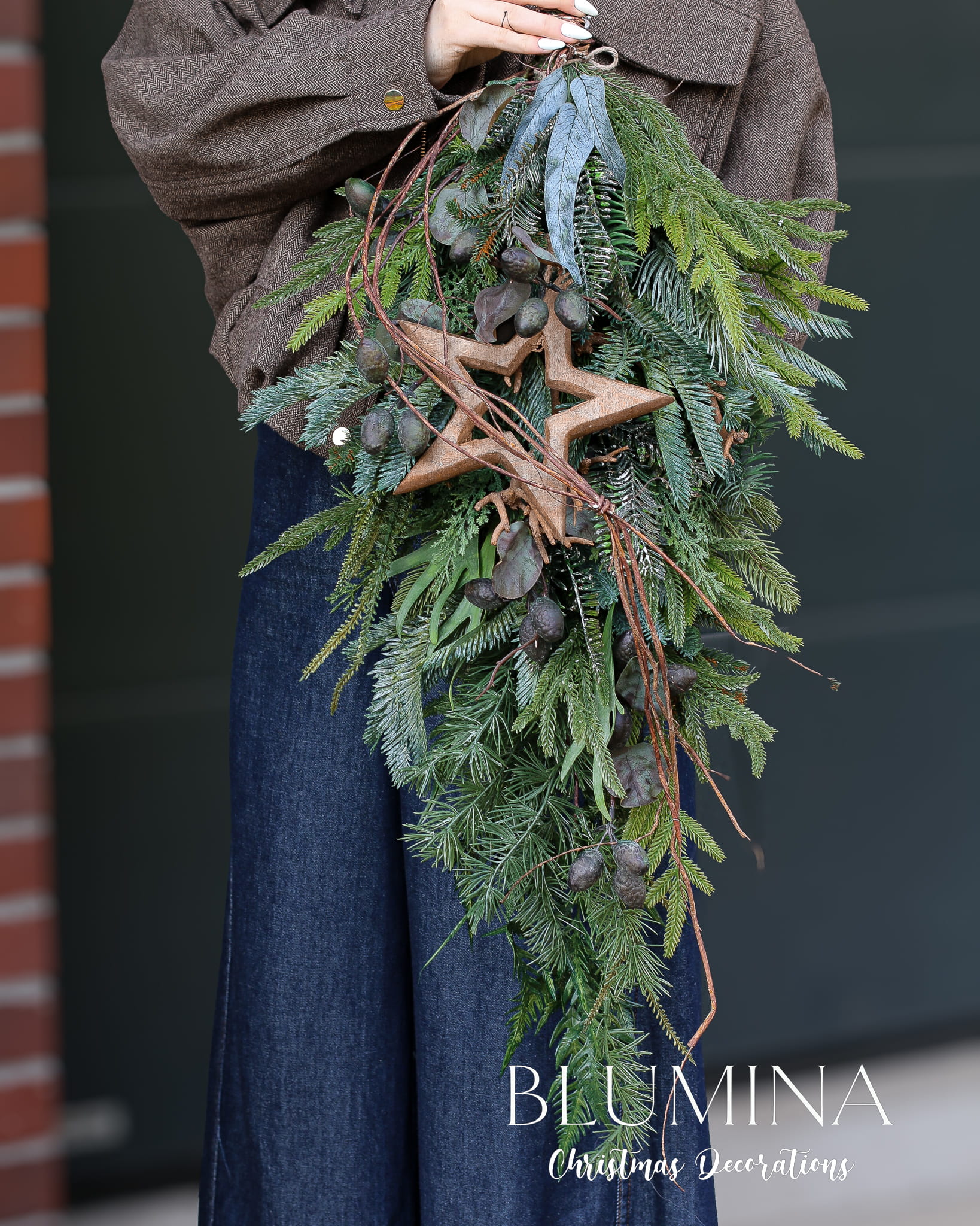 Zimowa zawieszka, wykonana z różnorodnego, sztucznego igliwia, eukaliptusa i głogu.