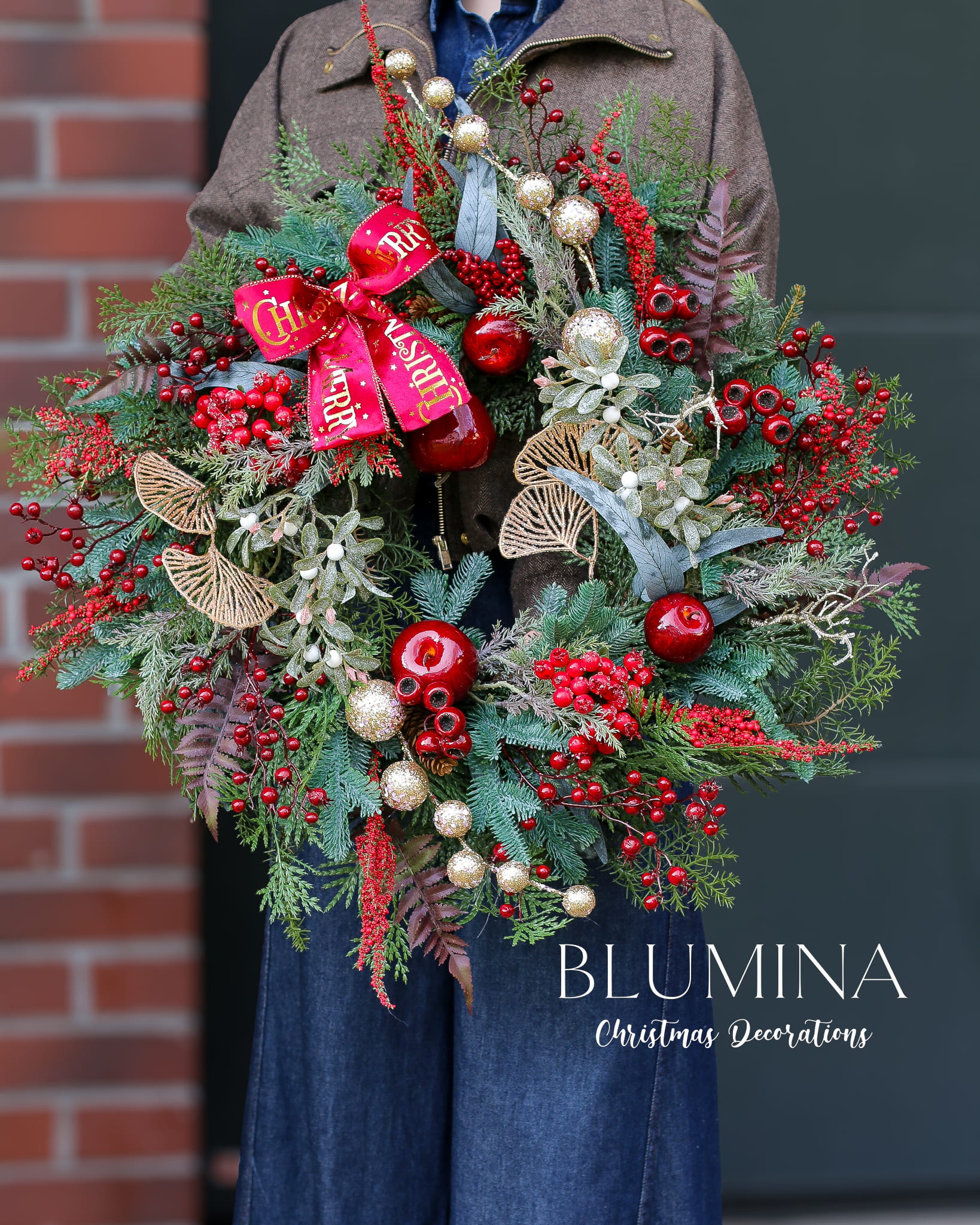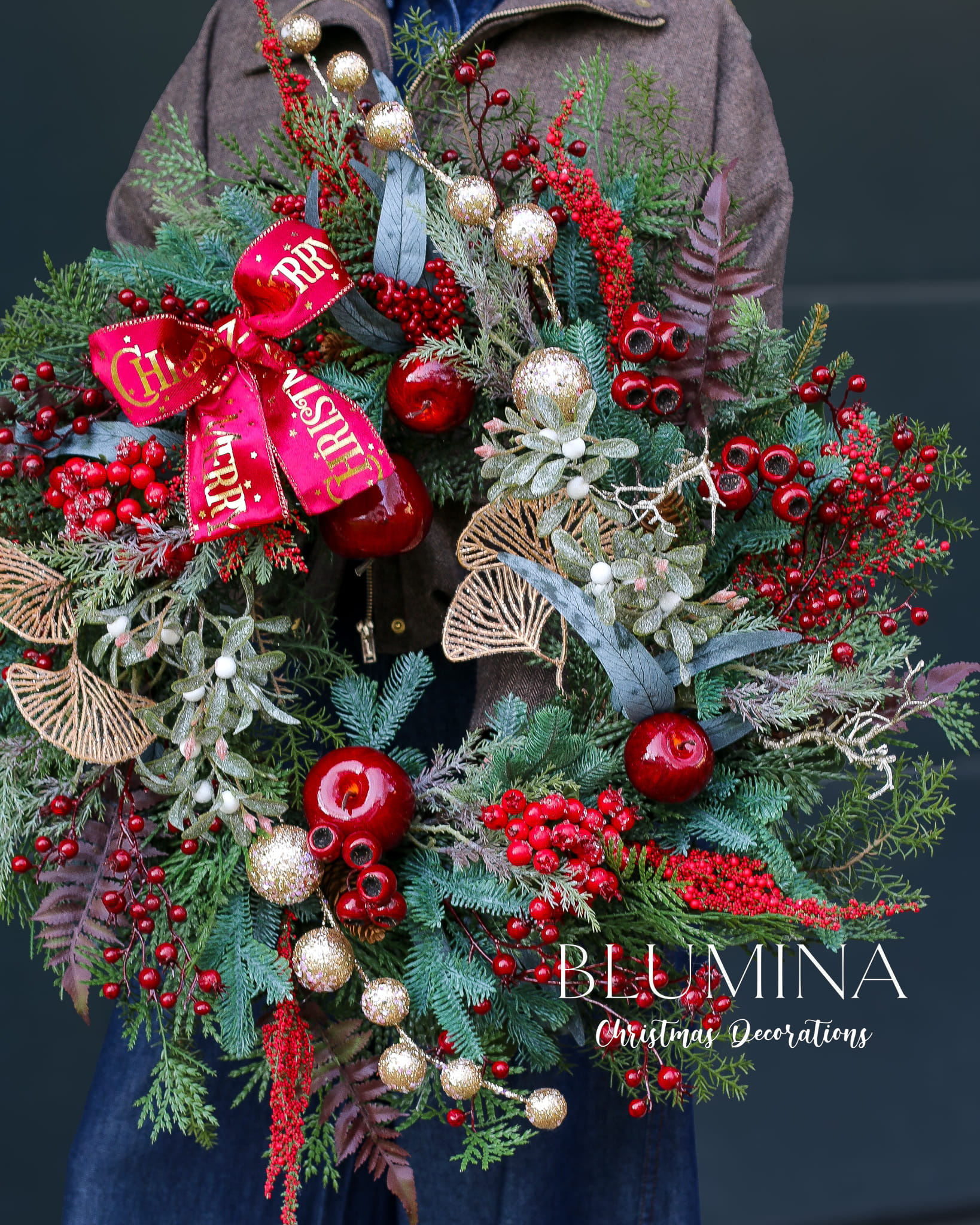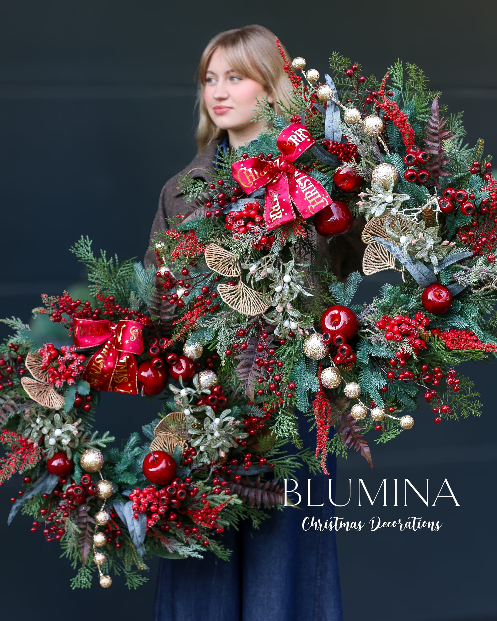 Duży, świąteczny wianek na drzwi wykonany z trwałych, starannie dobranych kwiatów i dodatków.
