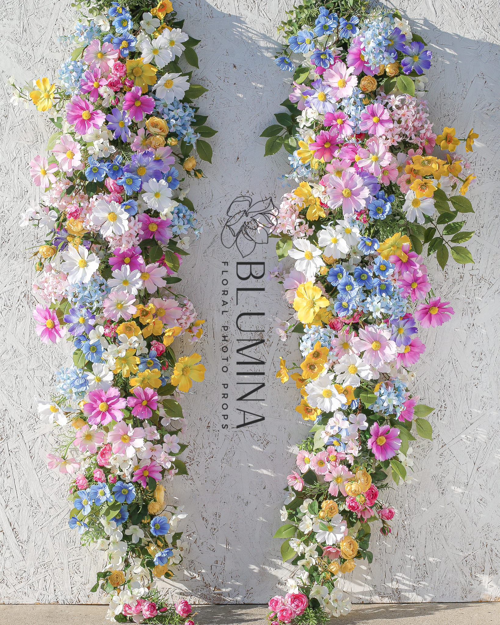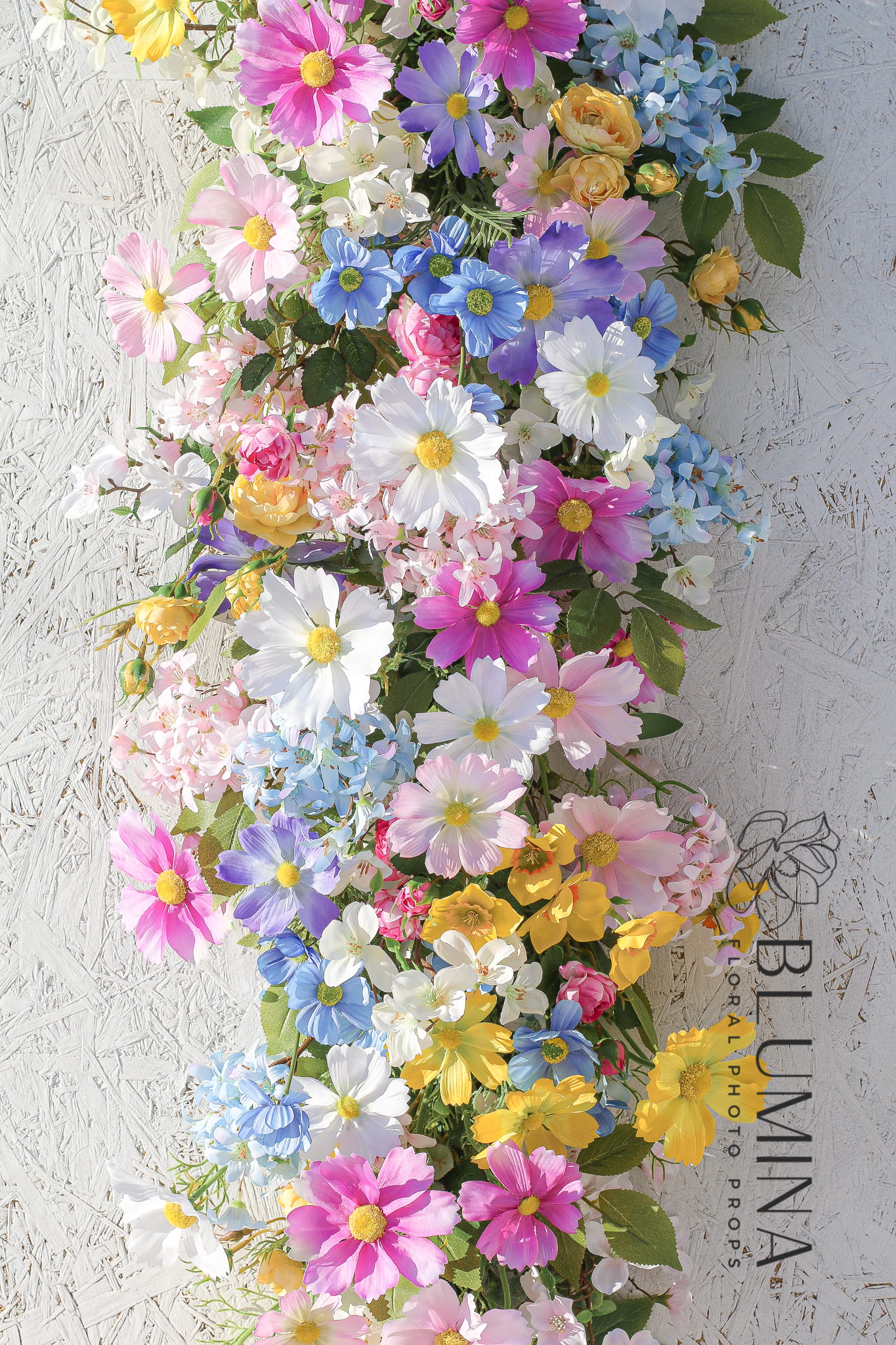 Zestaw szerokich, wiosennych girland, wykonanych głównie z kwiatów kosmosów, anemonów i jabłonki.